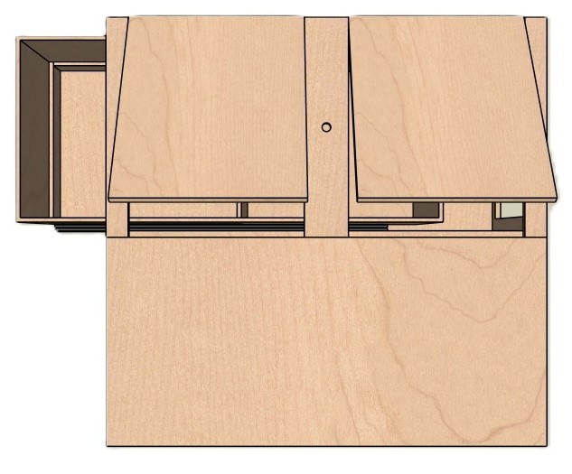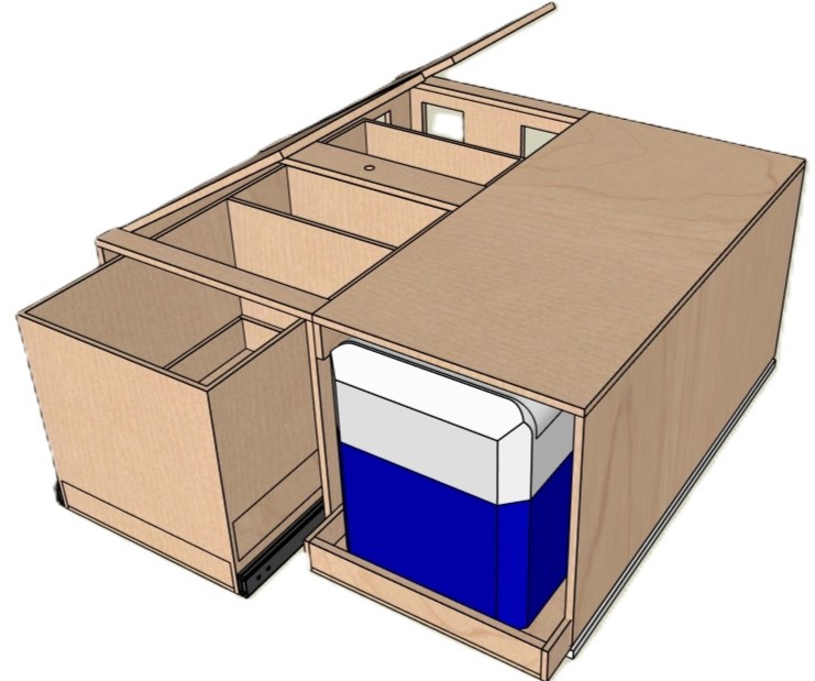 - Une base fixée au plancher dans laquelle est assemblé un tiroir coulissant permettant d’accueillir une glacière